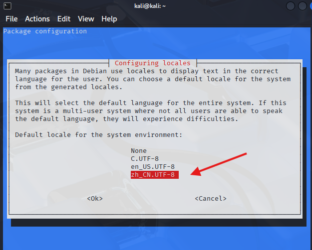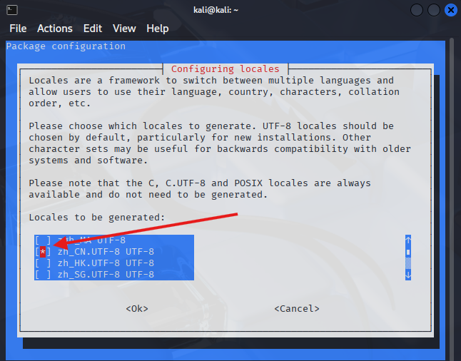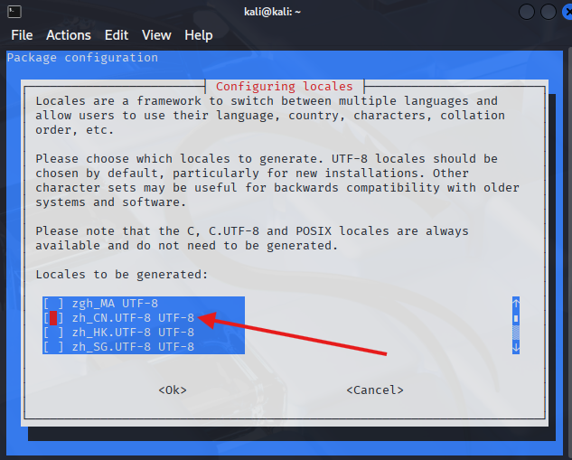 向下箭头按键选择到zh_CN.UTF-8,然后按回车键。